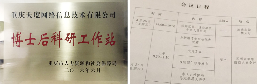 2017年4月27日,重慶市人力資源和社會保障局、重慶市博士后管理辦公室舉辦的“全市博士后工作會”在五洲大酒店召開,重慶市人社局陳元春局長為“重慶天度網(wǎng)絡信息技術(shù)有限公司”等新增博士后站進行了授牌。
