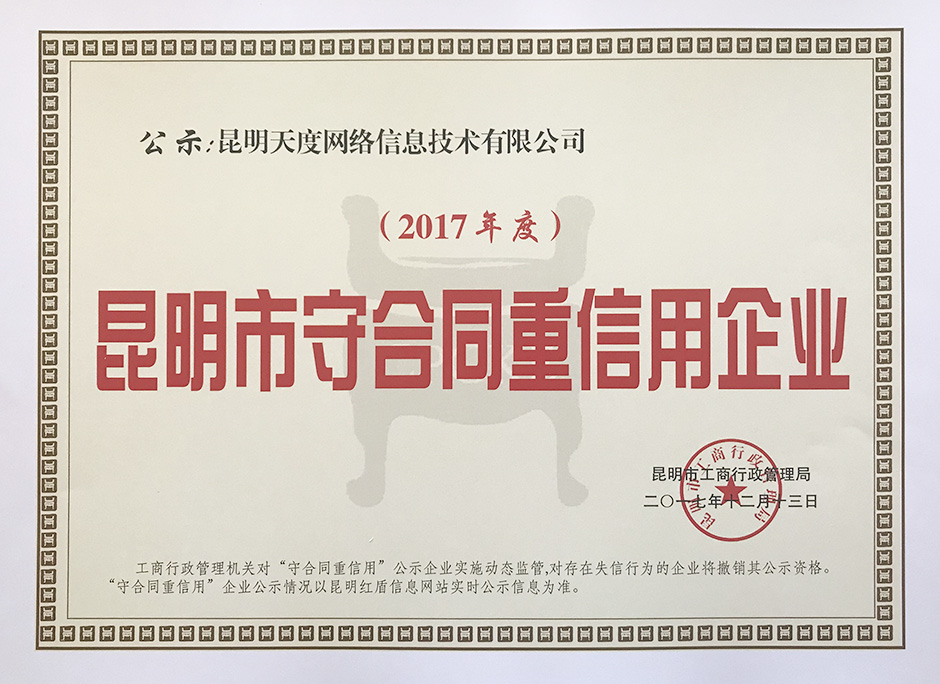 天度網(wǎng)絡(luò)公司被評(píng)為昆明市守合同重信用企業(yè)