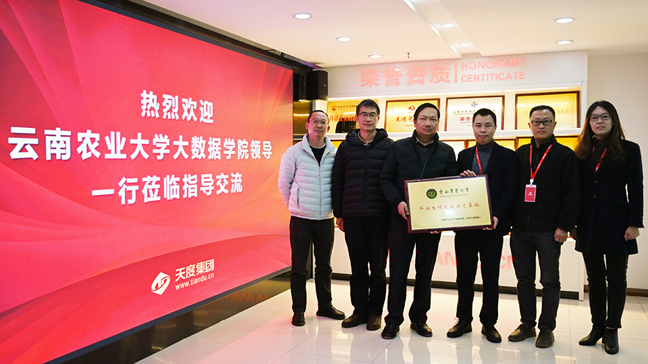 云南農(nóng)業(yè)大學(xué)煙草學(xué)院黨委書(shū)記李作森,大數(shù)據(jù)學(xué)院(信息工程學(xué)院)黨委書(shū)記王燦宇,副院長(zhǎng)楊建平,副書(shū)記趙紅波等領(lǐng)導(dǎo)一行到天度集團(tuán)總部指導(dǎo)交流,雙方就校企合作、就業(yè)實(shí)習(xí)等領(lǐng)域合作達(dá)成意向并現(xiàn)場(chǎng)簽署《合作協(xié)議》,云南農(nóng)業(yè)大學(xué)大數(shù)據(jù)學(xué)院向天度集團(tuán)進(jìn)行“畢業(yè)生預(yù)就業(yè)實(shí)習(xí)基地”授牌。