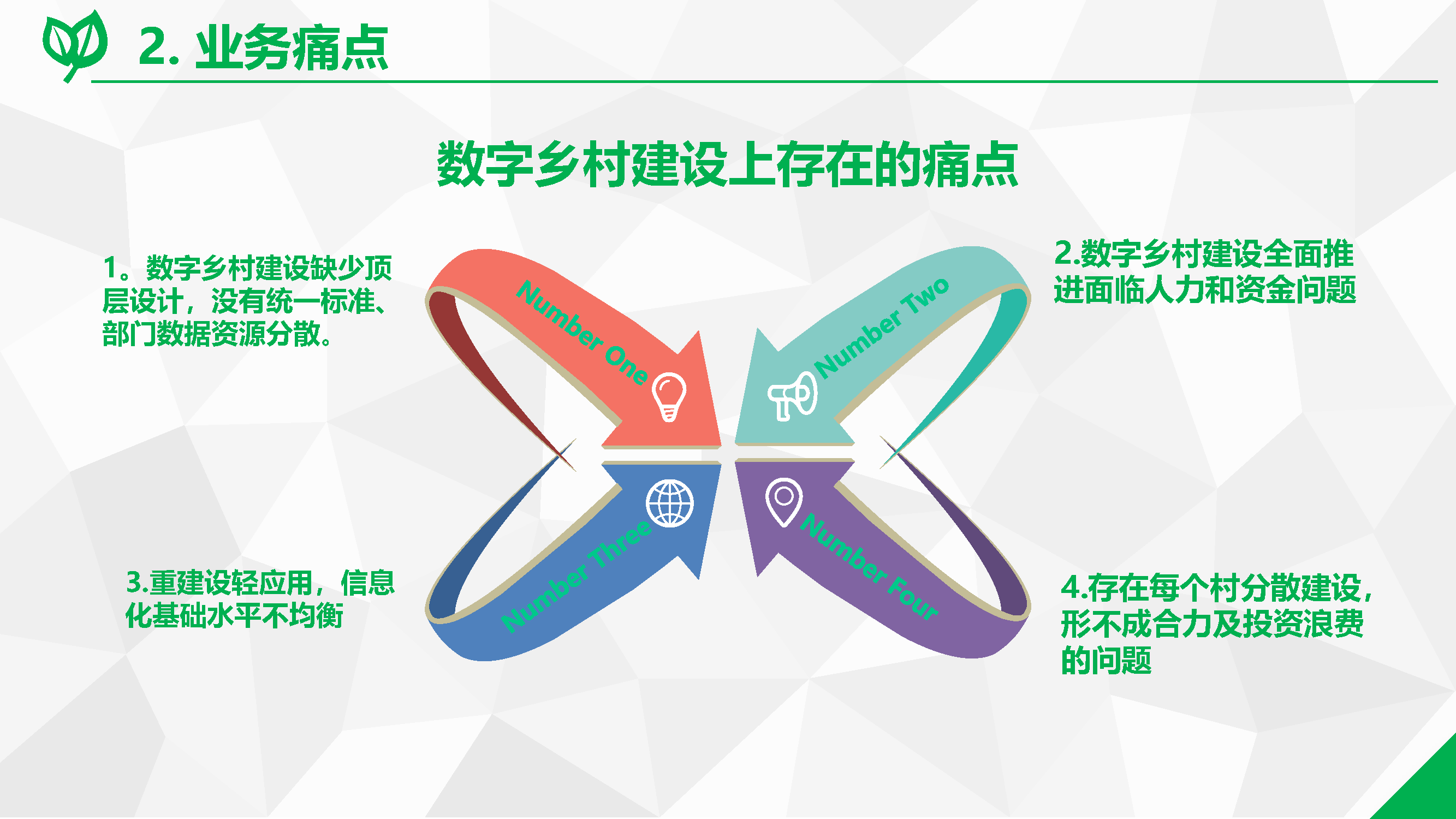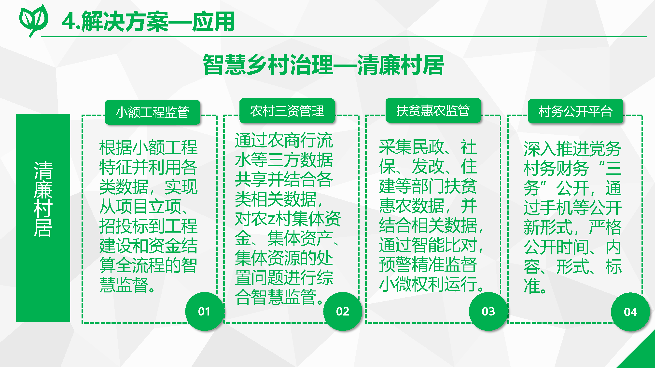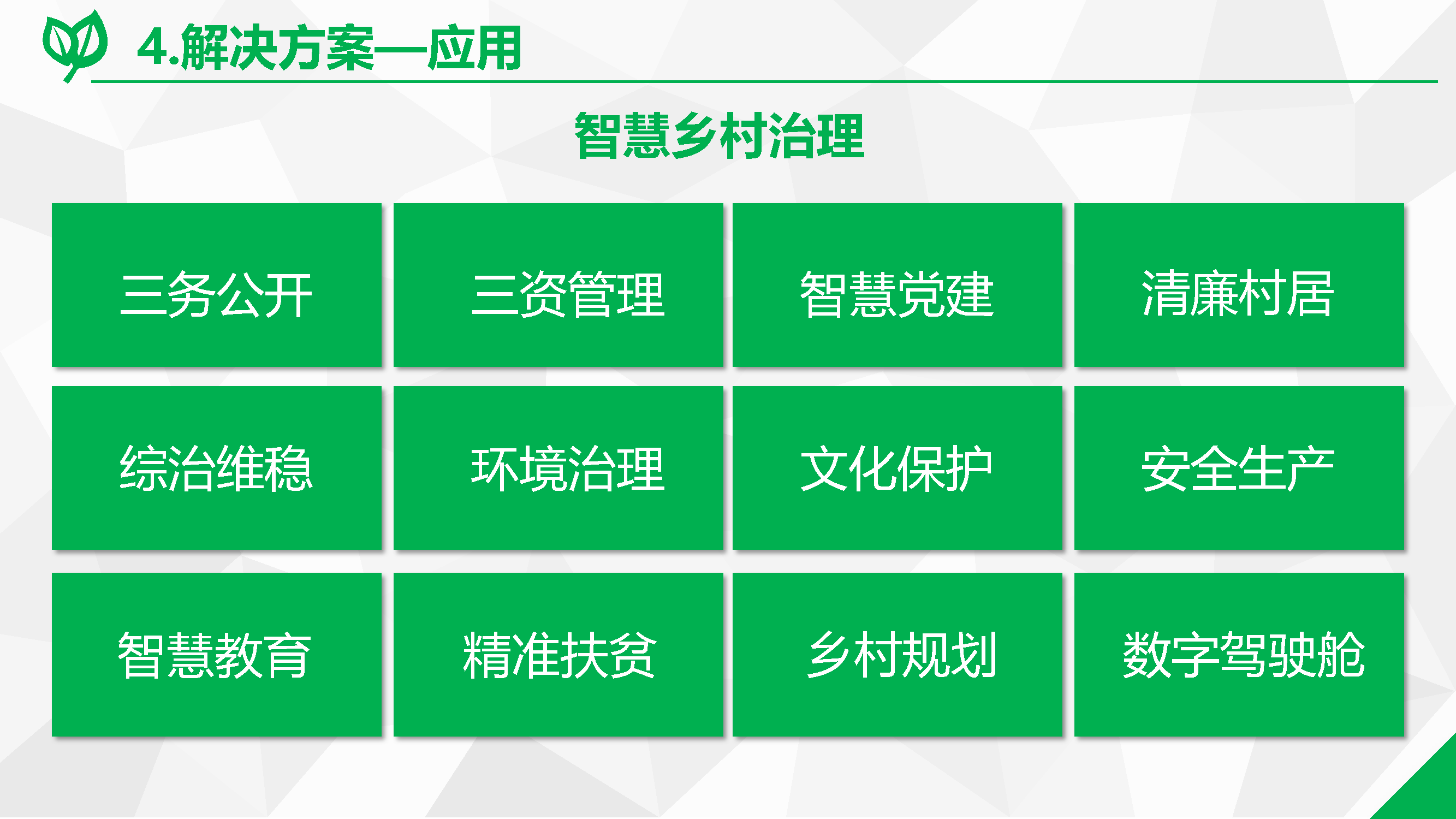 根據(jù)鄉(xiāng)村振興戰(zhàn)略的總體部署,鄉(xiāng)村治理工作應(yīng)著重提升智能化、精細化與專業(yè)化水平。因此,結(jié)合自身的數(shù)字化應(yīng)用開發(fā)能力,聚焦智慧黨建、村鎮(zhèn)環(huán)境保護,以及城鎮(zhèn)綜合行政執(zhí)法工作的數(shù)字化,為縣域建立健全數(shù)字治理新模式提供支撐。