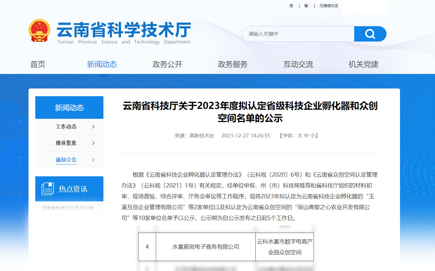 根據(jù)《云南省科技企業(yè)孵化器認定管理辦法》(云科規(guī)〔2020〕6號)和《云南省眾創(chuàng)空間認定管理辦法》(云科規(guī)〔2021〕1號)有關(guān)規(guī)定,經(jīng)單位申報、州(市)科技局推薦和省科技廳組織的材料初審、現(xiàn)場查驗、綜合評審、廳務會審議等工作程序,天度集團旗下水富蔚嵐電子商務有限公司獲“省級眾創(chuàng)空間”認定。目前公司已獲得昭通市科技局“昭通市數(shù)字電商科技企業(yè)孵化器”、省工信廳“2022年度中小企業(yè)公共服務示范平臺”等多項認定和榮譽。