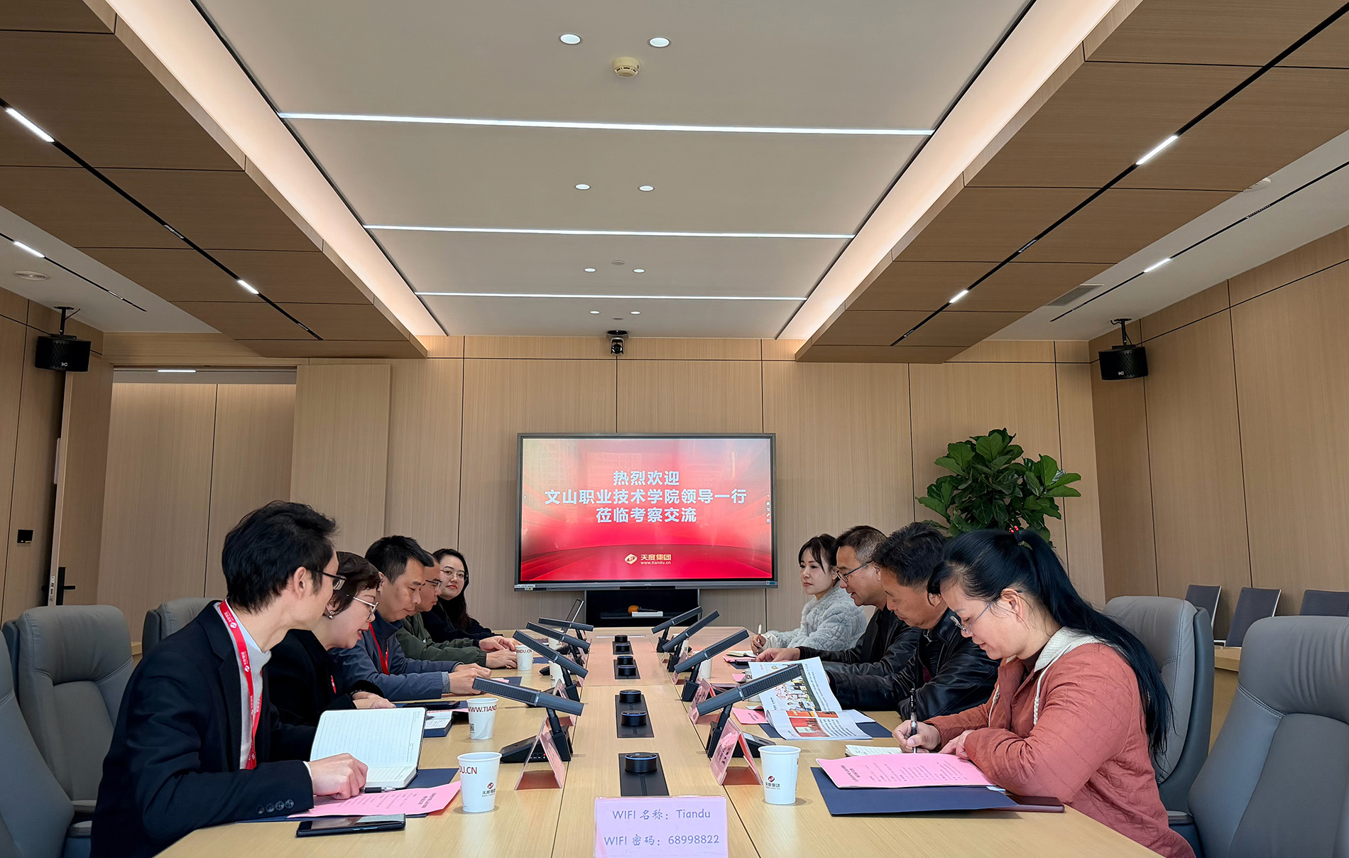 天度集團(tuán)結(jié)合自身在智能制造、人工智能應(yīng)用、數(shù)字化運(yùn)營(yíng)等領(lǐng)域的發(fā)展實(shí)踐,分析了相關(guān)行業(yè)對(duì)技術(shù)技能人才的能力要求,并介紹了集團(tuán)在產(chǎn)教融合方面的現(xiàn)有模式與案例。儂援校長(zhǎng)對(duì)天度集團(tuán)二十年取得的成就表示贊賞,并介紹了文山職業(yè)技術(shù)學(xué)院在專業(yè)建設(shè)、人才培養(yǎng)方面的特色與規(guī)劃。他表示,此次參訪旨在深化學(xué)校與省內(nèi)優(yōu)質(zhì)企業(yè)的聯(lián)系,推動(dòng)教育鏈、人才鏈與產(chǎn)業(yè)鏈、創(chuàng)新鏈的有機(jī)銜接。