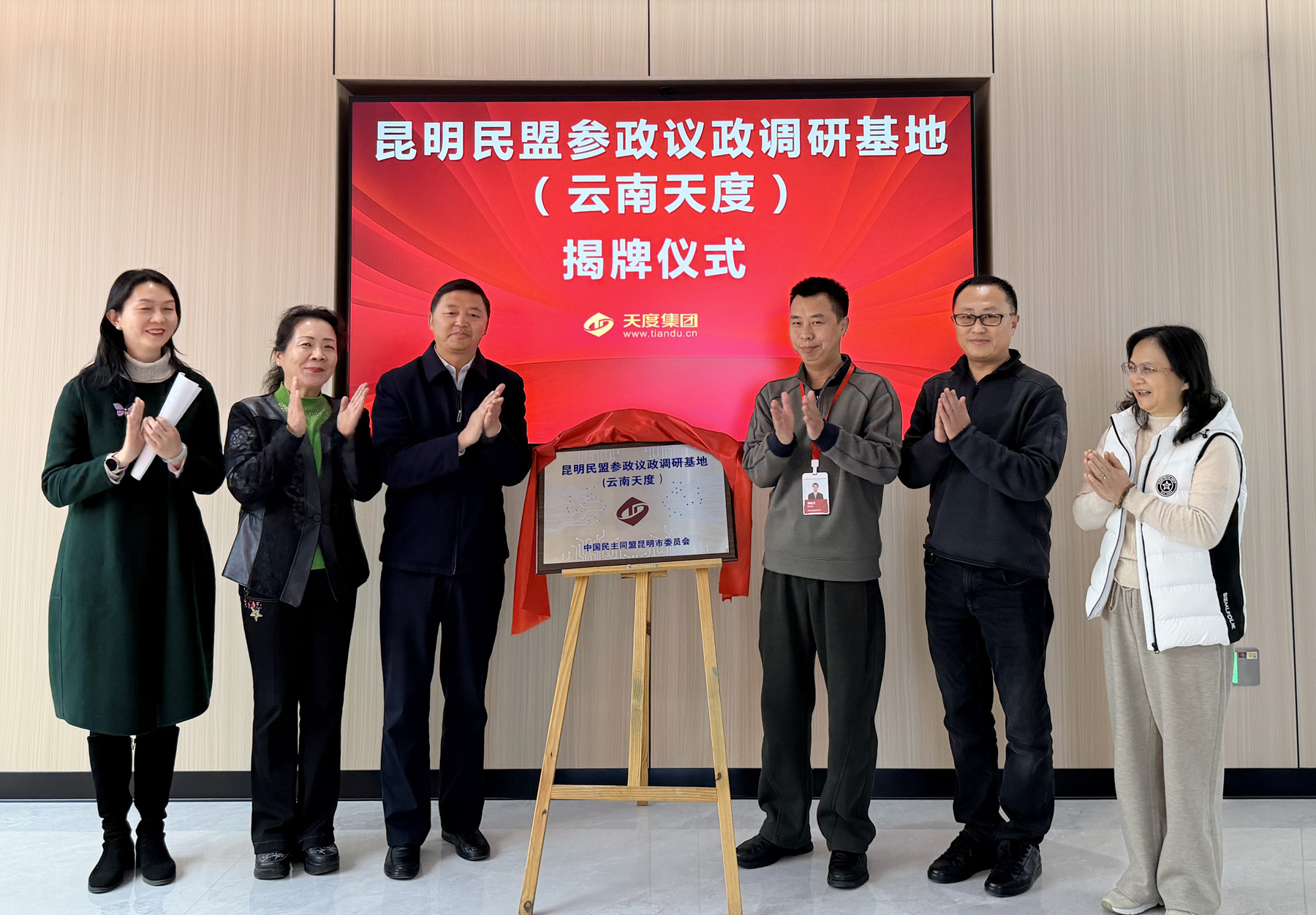 1月28日,民盟昆明市委會在云南天度軟件系統(tǒng)有限公司舉行“昆明民盟參政議政調(diào)研基地”揭牌儀式,此舉旨在為民盟各級組織和骨干盟員參政履職、交流協(xié)作以及成果轉(zhuǎn)化和活力提升搭建常態(tài)化、實體化的工作平臺。昆明市政協(xié)副主席、民盟昆明市委會主委吳波出席儀式并為基地揭牌,為基地建設(shè)運行提出要求和希望。